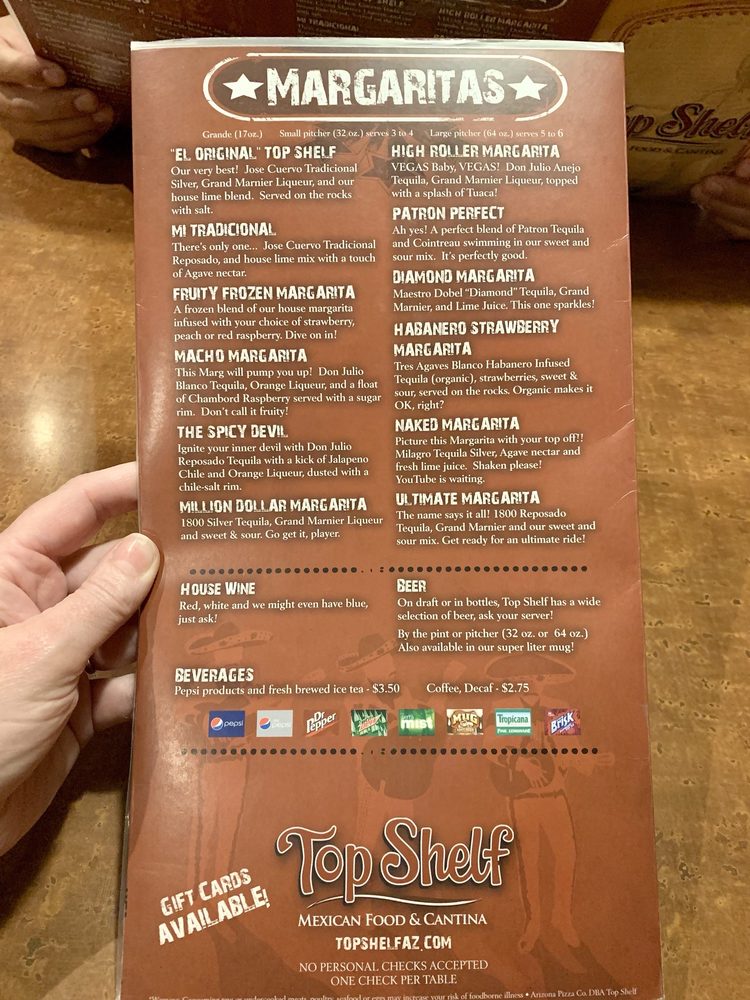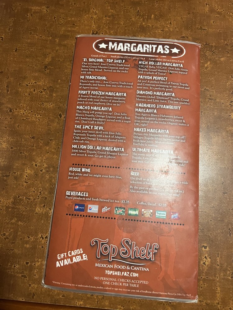 Welcome to Top Shelf Mexican Food & Cantina, where vibrant flavors meet a lively atmosphere in Peoria, AZ. This inviting establishment boasts a menu rich in authentic Mexican cuisine, perfect for a cozy lunch or a lively dinner. Whether you’re craving sizzling burritos, flavorful enchiladas, or the standout chiles rellenos, there's something delightful for everyone—especially with ample vegetarian options available.